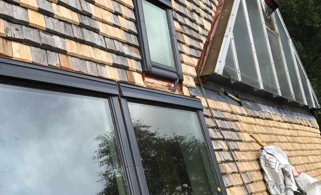 sur ces photos un toit en tuiles de châtaigné avec ses chéneaux, noues et raccords velux en cuivre.